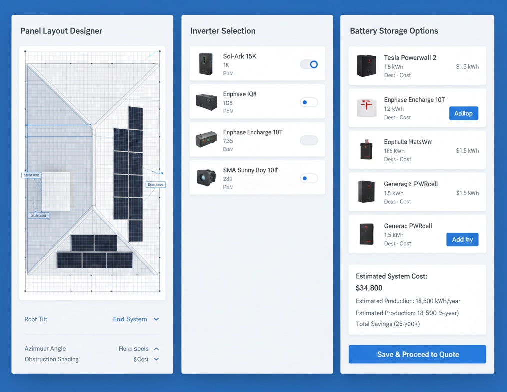 Intelligent solar system design with panel layouts, inverter sizing, and battery storage